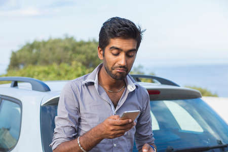 Indian skeptical frustrated surprised sad man checking looking at phone texting, calling dealership after a car breakdown