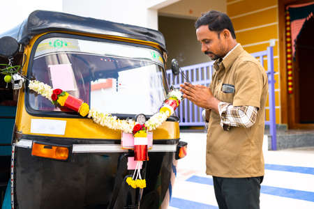 driver doing puja by offering incense to his new auto rickshaw before driving - concept of beliefs, rituals, start of new transportation business