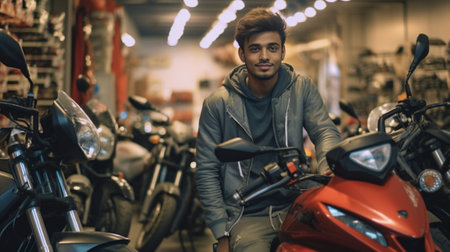 Bikes are not for everyone Handsome young man sitting on his bike with motorcycle garage in the background : Generative AI