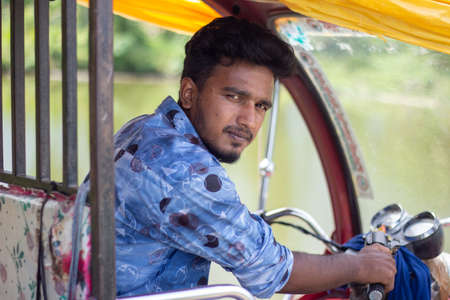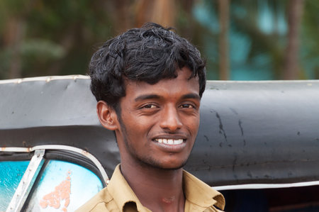 KOVALAM, INDIA - DEC 28, 2014: Unidentified Indian taxi driver man of auto rickshaw in fishing village. Kovalam. Kerala. India