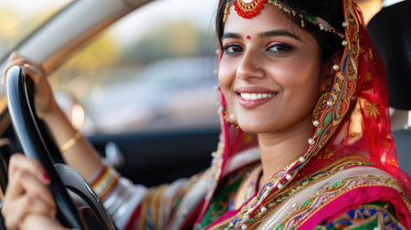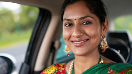 A radiant woman dressed in a vibrant traditional sari, smiling warmly inside a car, perfectly capturing the essence of cultural beauty and joy.