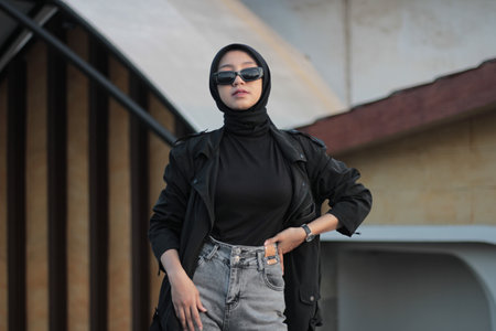 A young Asian woman wearing a hijab and jeans posing outdoors, following a concept with a black outfit