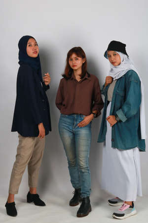 Fashion portrait of three best friends posing in studio