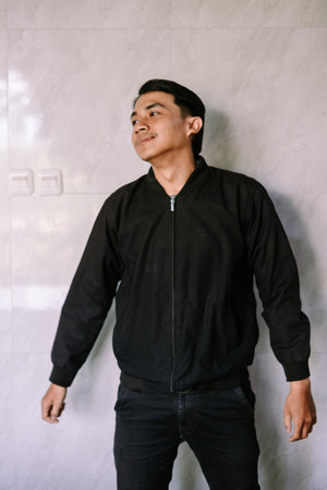A young Asian man wearing a stylish black bomber jacket and dark pants, standing against a light wall. He is looking to the side with a calm expression, suggesting contemplation or confidence.
