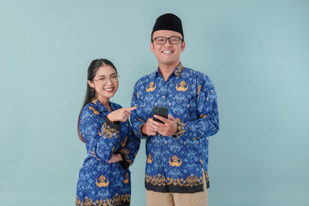 Two joyful Indonesian government workers wearing blue batik uniform and glasses pointing to the cellphone he holds. PNS civil servant concept.