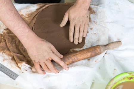 Pottering Ideas and Concepts. Closeup of Hands of Male Worker Rolling a Piece of Wet Clay on Table Before Moulding.Horizontal Composition