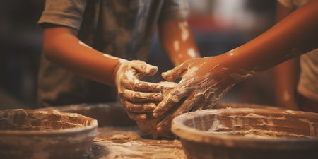 Generative AI, kid hands with clay making of a ceramic pot in the pottery workshop studio, hobby and leisure concept