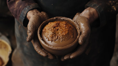 An artisan's hands skillfully shape wet clay on a pottery wheel, creating a unique bowl that reflects artistry and tradition in craftsmanship.