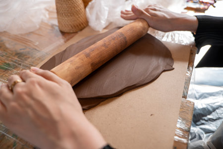 Hands engaged in pottery creation at a workshop, with clay and tools scattered on the table, showcasing artistic collaboration in progress