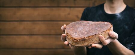baker hands holds vegan rye whole grain sourdough bread in shape of heart and give, concept of share care, kindness, joy and love, handmade private bakery offer, valentine gift, banner with copy space