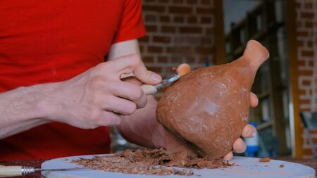 Professional male potter shaping and scraping dry clay jar with special tool in pottery workshop, studio. Crafting, artwork and handmade concept