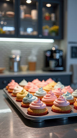 Colorful iced cupcakes on kitchen counter with blurred background. That the image is generated using AI.