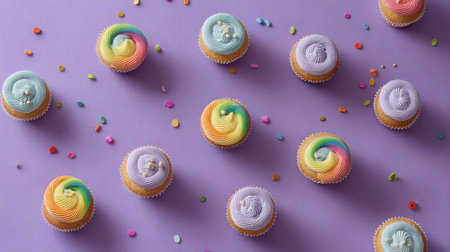 A vibrant arrangement of colorful swirled cupcakes topped with bright icing and playful sprinkles, set against a purple backdrop, ideal for festive occasions.