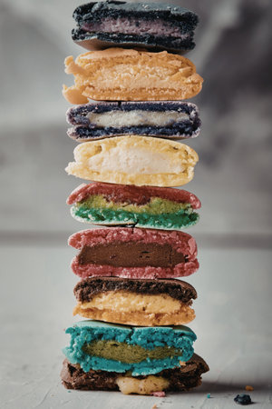 Closeup of delicious fresh macaroon with different fillings on the table, macro photo