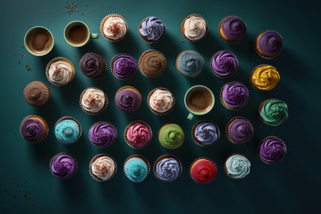 An artistic arrangement of various cupcakes and sweet treats on a vibrant surface, showcasing a delightful assortment of colors and textures. Perfect for dessert lovers and celebrations.