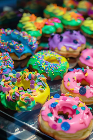 This image captures a colorful assortment of ring doughnuts. The focus is on the vibrant colors and creative icing designs, creating a visually appealing display of tasty treats.