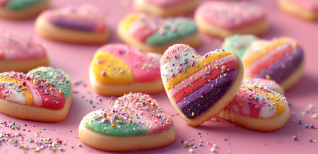 Creative food template. Heart shape Cookies with decorated with colourful icing and Sprinkles scattered laying on pink background. copy text space