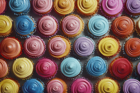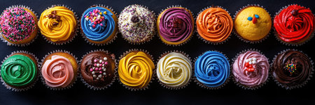 A row of colorful cupcakes with frosting on top. The cupcakes are arranged in a pattern, with some being more prominent than others. Scene is cheerful and festive
