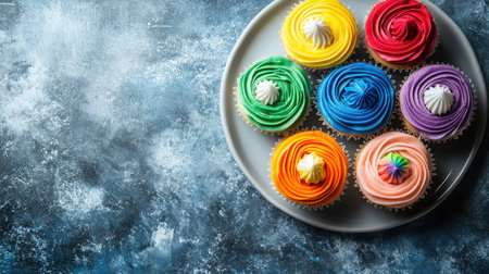 An array of vibrant cupcakes with colorful icing displayed on a plate. Perfect for celebrations, events, or simply indulging in a sweet treat.