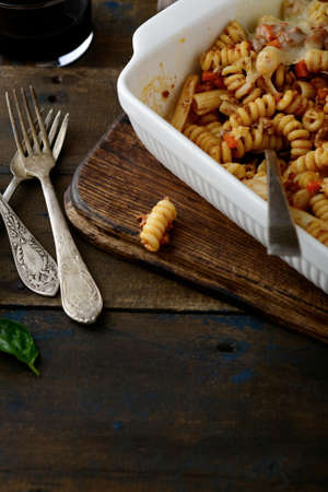 Pasta with a bolognese beef sauce in baking dish, forks and wine on old wooden table. Closeup