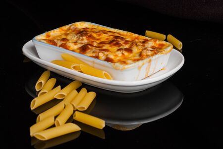 oven baked fresh pasta penne bolognese and mozzarella cheese dish