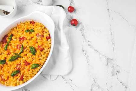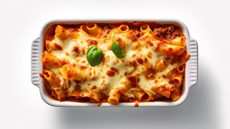 Paccheri baked with tomato sauce, mozzarella, bacon and basil. Italian culinary specialties. View from above.