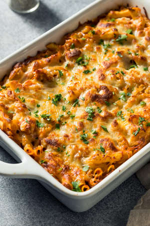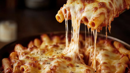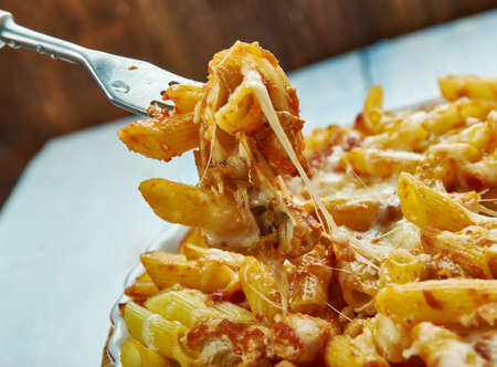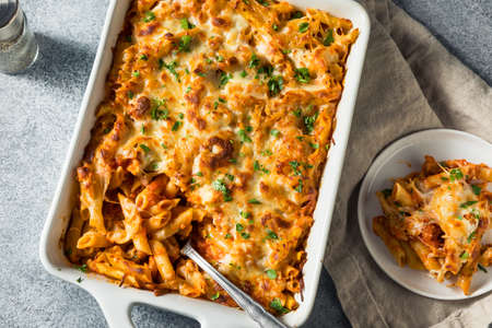 Chicken Parmesan Baked Ziti, close up Italian dishes