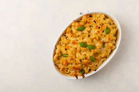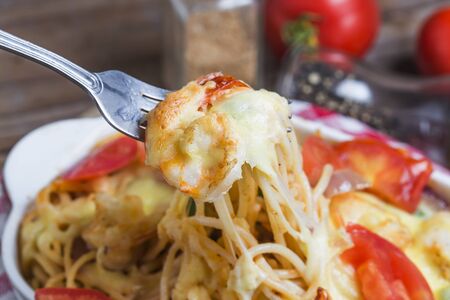 Baked Macaroni and cheese with shrimp dish. Italian food style.