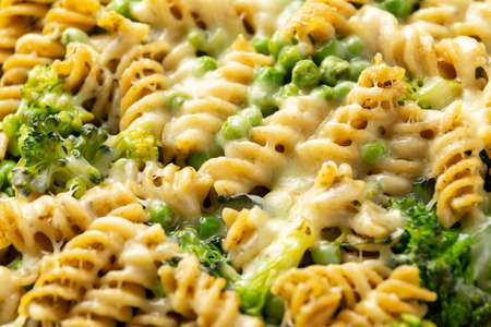 Baked Green peas, broccoli pasta with pesto sauce and parmesan cheese. healthy food.