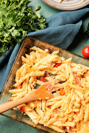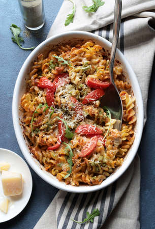 Italian fusilli pasta with tomato sauce and parmesan cheese on a white baking ceramic tray. Italian cuisine. Directly above.