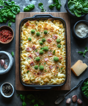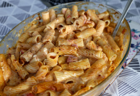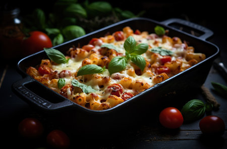 Pasta casserole with ham, cheese, basil and spices is served on a dark background