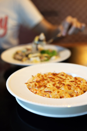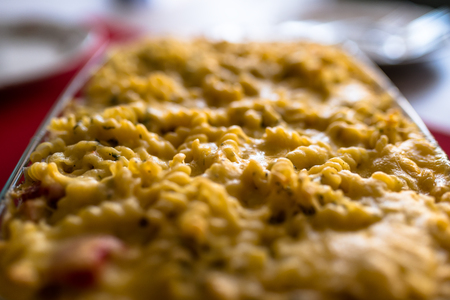 mac and cheese, macaroni pasta in cheesy sauce - American style