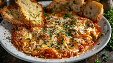 A tempting dish of pasta drenched in flavorful tomato sauce with melted cheese and fresh herbs, accompanied by slices of golden garlic bread on a rustic wooden table at a restaurant.