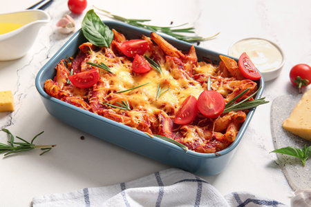 Baked penne pasta with tomato sauce and cheese in White bowl