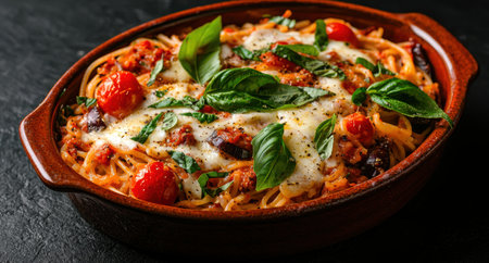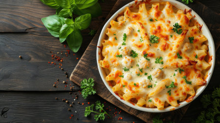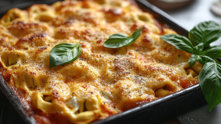 This image showcases a mouthwatering baked pasta dish topped with melted cheese and fresh basil, perfect for a cozy dining experience or a savory home meal.