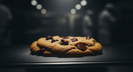 Delicious chocolate chip cookie with melted chips on a cooling rack, illuminated by dramatic light in a dark setting, emphasizing texture and warmth.