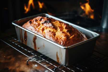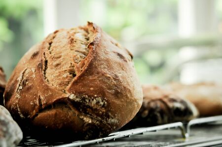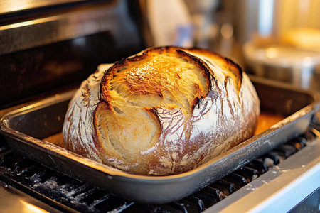 Freshly baked artisanal bread cooling on a stovetop in a cozy kitchen setting during a sunny afternoon. Generative AI