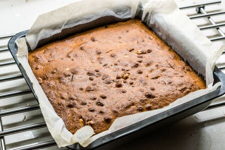 Rectangular ruddy metropolitan cake-bread in a metallic baking dish on a dark background. Close-up. View from above. Copy space.