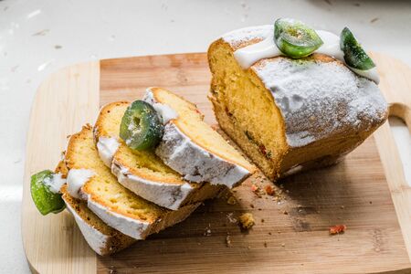 Fig Cake with Jelly Fruits and Powdered Sugar on Wooden Board. Ready to Serve.