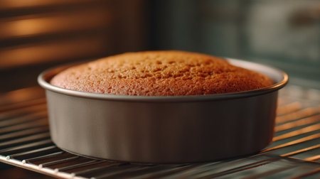 A round cake is baking in an oven on a cooling rack, showcasing a golden-brown surface under warm lighting, ideal for culinary delights and celebrations.