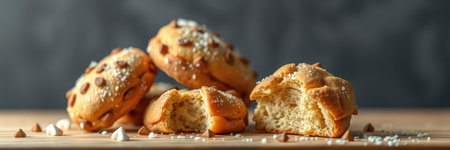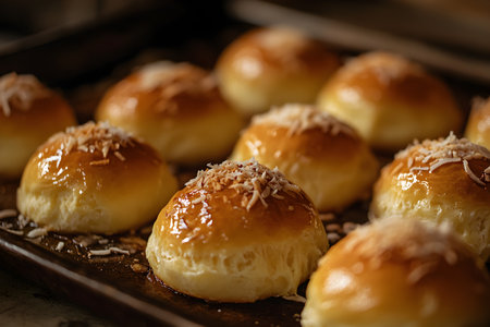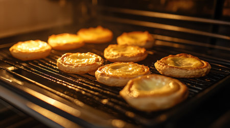Freshly baked pastries arranged on a baking tray in a cozy kitchen environment