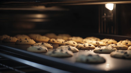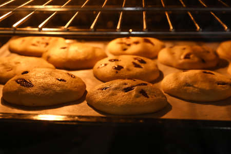 Freshly baked chocolate chip cookies in the oven. Selective focus.