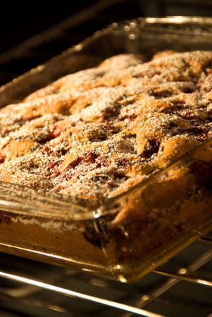 Golden Brown Plum Cake Baking in Traditional Oven with Soft Sunlight