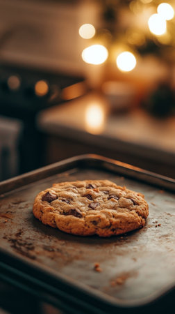 Warm chocolate chip cookie on baking tray, cozy home baking concept