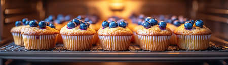 Freshly baked blueberry muffins in oven tray shallow depth of field warm ambient light