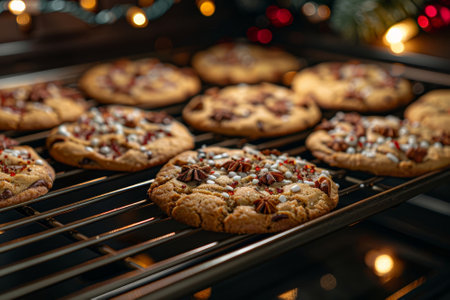 A batch of warm chocolate chip cookies rests on a cooling rack, adorned with festive sprinkles. Soft golden cookies shine, evoking the warmth of home baking during the holiday season..