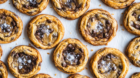 A visually appealing assortment of freshly baked chocolate chip cookies showcases golden edges and a soft center, lightly dusted with powdered sugar for a delightful treat.