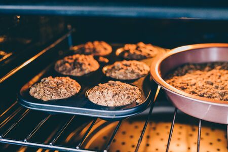 healthy vegan desserts to bake at home, oatmeal muffins and cake made of oats cinnamon and almond milk