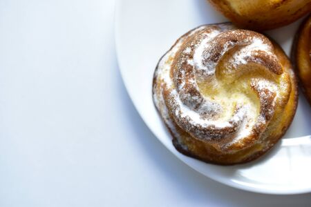Delicious and beautiful curd rolls on a white plate with sprinkles