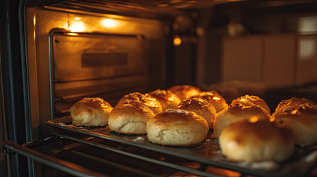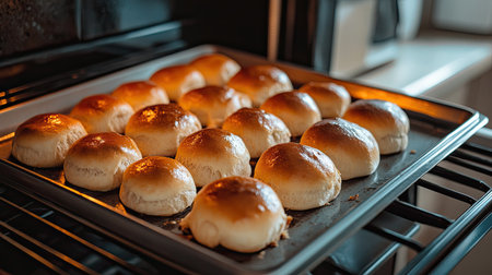 An inviting kitchen scene with a baking sheet of homemade buns in the oven, the tops turning golden brown, perfect for any family meal